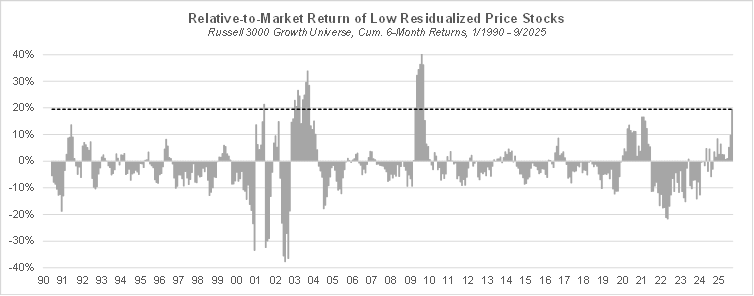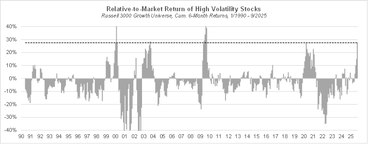 Relative to history since 1990, the cumulative 6-month relative performance by high volatility stocks is in the 98th percentile and is even higher in magnitude than what was observed in 2020 when extraordinary COVID stimulus measures were enacted. Other instances of strong high-volatility stock outperformance include H1 2009 and H1 2003, as the economy was recovering from a recession, but also late 1999/early 2000, at the peak of the internet bubble. I believe the balance of data evidence leans towards the current situation being closer to an economic recovery than the peak of a bubble.