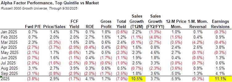 Within alpha factors, stocks with high price momentum or strong earnings revisions outperformed strongly last month, and those with robust trailing or expected revenue growth have also done well. By contrast, stocks with low valuation multiples or high profitability ratios have done poorly. Year-to-date, stocks with high earnings revisions or trailing revenue growth have been the best performers with shallow drawdowns, highlighting investors’ preference for companies exhibiting consistent growth in revenues and earnings in the current, uncertain, macro environment.