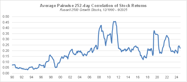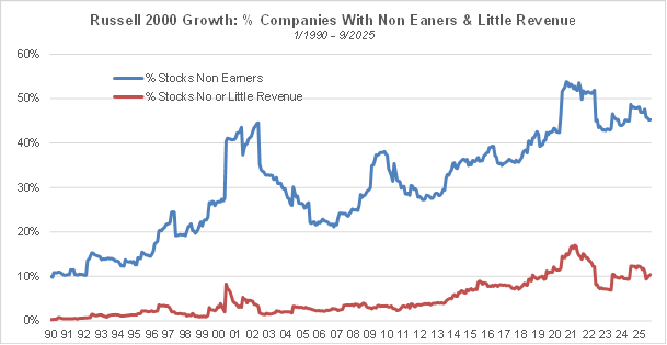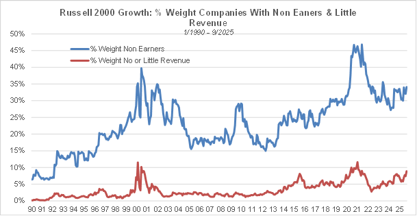 Yet another indication of investors’ optimism is the rising prevalence, in terms of both number of stocks and aggregate weight, of companies with negative earnings (defined as negative GAAP net income over the past 12 months) and negligible revenues (defined as less than 1% of market cap) within market benchmarks, and more specifically small cap focused ones. As shown below, the number of companies with negative earnings or negligible revenues and their aggregate weight in the Russell 2000® Growth have been on a rising trend since the mid-2000s. The increasing popularity of passive investing has certainly contributed to that trend, since, by definition, those investors buy the whole index and do not discriminate between stocks based on fundamentals. As of the end of September, over 45% of companies in the Russell 2000® Growth are non-earners and over 10% of them have no or insignificant revenues, and those represent, respectively, ~34% and ~9% of the index. Case in point, the largest quantum computing companies (IonQ, Quantum Computing Inc, D-Wave, Rigetti), which are essentially just long-term research projects at this point, make up 2.5% of the index, with IonQ being the 3rd largest holding. The increasing prevalence of companies with unproven business models or poor fundamentals may make it easier for fundamental managers to beat the benchmark in the long run but it leaves them vulnerable to shifts in investor sentiment, with their portfolios being exposed to the risk of significant relative performance drawdowns during “risk on” regimes.