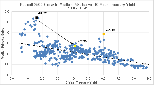 Median valuations for small & mid cap growth stocks have not changed substantially since last month. In that space, the median price-to-sales indicates only moderate over-valuation given the current level of the 10-year yield but is nowhere near the extremes reached in 6/2000 and 4/2021.