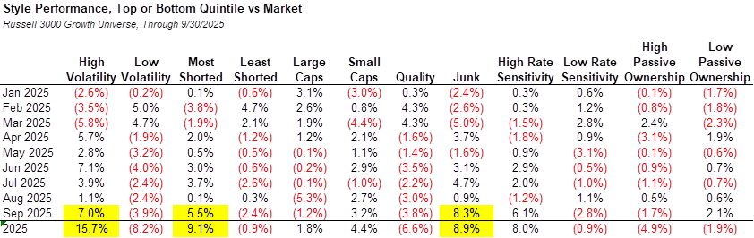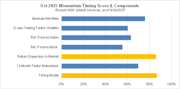 Our momentum timing model continues to indicate that high momentum stocks have a high probability of under-performing in October, but the model’s indication is supported by only one of the underlying variables, the return dispersion within the market observed last month, which has been high relative to history.