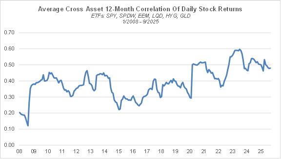 Another indicator of investors’ concerns regarding currency debasement is the high return correlation between private sector assets that are most likely to offer protection against such currency debasement, which suggests that the primary motive behind investors’ decisions is to preserve the purchasing power of their capital. The return correlation between those assets, which has risen significantly since 2022, hovers near historical highs. The average cross-asset correlations shown below are based on US ETFs representing major asset classes: SPY (S&P 500®), SPDW (developed markets ex. US equities), EEM (emerging markets equities), LQD (investment grade corporate bonds), HYG (high yield corporate bonds), and GLD (Gold), and are based on trailing 252-day periods.