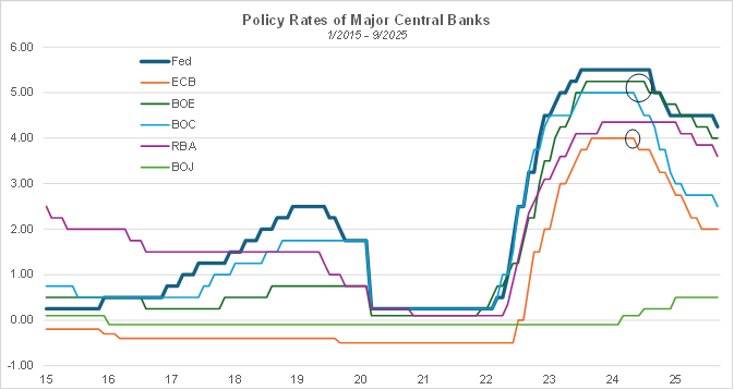 The latest FOMC meeting went pretty much as expected. Given the 2018 precedent, it was conceivable that Jay Powell would cave to the intense political pressure he was facing from the administration and make a 50-bps cut to pre-empt economic weakness that was conveyed by the latest payroll numbers, but he opted instead for a widely expected 25 bps “risk management” cut. As a chairman on his way out, he probably doesn’t want to rock the boat. In the current monetary policy cycle, it appears the Fed is behind the curve compared to the ECB, which has been able to get back to the 2% inflation target. To Jay Powell’s defense, there seems to be a US specific issue with inflation remaining well above target despite tight monetary policy, but in the current fiscal dominance regime, the likely culprit is excessive government spending. By keeping rates at a relatively high level, he can avoid being blamed for a potential resurgence in inflation that wouldn’t be his fault.
