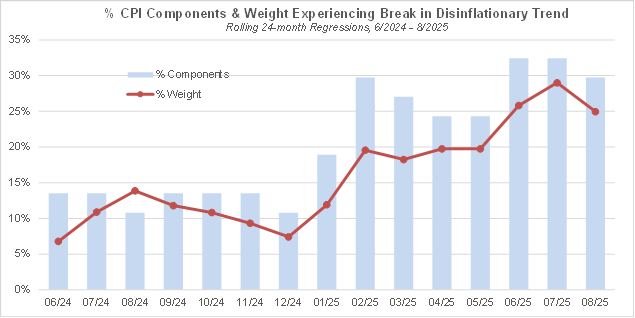 So far this year, inflation has remained in-check, even though core inflation remains meaningfully above the Fed’s target. In last month’s note, we introduced analysis to gauge whether inflation was inflecting upward in various subcomponents of the CPI. We observed that the number of components (and their associated aggregate weight in the CPI) have been on an uptrend since the middle of 2024. Updating the analysis with the August release of CPI numbers shows that the breadth of components experiencing inflation acceleration has experienced a modest drop that doesn’t invalidate the overall trend. We’ll keep updating this analysis monthly to identify whether more components of the CPI experience acceleration in inflation.