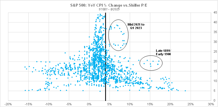 Historically, there has been an inverted U-shaped relationship between inflation and the market’s valuation multiple. Episodes of extreme deflation or inflation can be very detrimental to economic growth, and equities typically trade at a low multiple during those periods. The sweet spot with the highest market multiples (in terms of long term cyclically adjusted P/E) corresponds to CPI inflation between 1 and 4%. The current inflation rate (at near 3%) thus remains consistent with the market’s record valuations. However, should inflation accelerate past 4%, the market could very well experience a meaningful correction that would bring the overall multiple in line with the higher inflation rate.