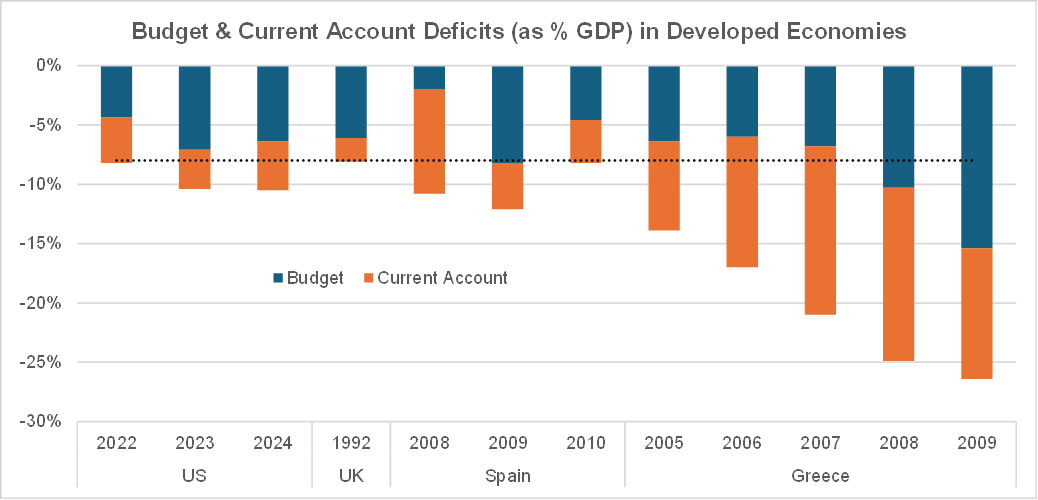 Over the past four decades, the level of public debt in the US has raised concerns periodically but has been largely shrugged off until recently. The large budget deficits in the years following the GFC brought those concerns to the forefront, but the low interest rates that prevailed at the time not only made the high debt burden manageable, but also created the illusion that the US could get away with spending whatever amounts it may choose without consequences. When the COVID crisis arose, the government showed no restraint in the amount of fiscal stimulus it provided to the economy – 27% of GDP for years 2020-2021 (https://taxfoundation.org/blog/us-covid19-fiscal-response), pushing federal spending during the COVID years – as a percentage of GDP – far beyond the levels reached during the New Deal. However, what makes a difference this time around is the resurgence of inflation, which has pushed interest rates, and thus the Federal government’s interest expenditures, much higher than they were during the 2010s, leading to persistently higher deficits, even after the end of extraordinary stimulus measures. Those high budget deficits, on top of lower magnitude but still sizeable current account deficits have led the US to run combined deficits of 8+% of GDP (>10% if one excludes 2022) since 2020. Running high twin deficits (especially if persistently so) has historically led to serious macroeconomic crises, and not just in emerging markets. In 1992, the UK (which ended up with an 8% twin deficit as % of GDP that year) had to withdraw its currency from the European Exchange Rate Mechanism – a precursor to the Euro – as it could not maintain the British pound’s parity with the Deutschemark (George Soros became famous then for – correctly – betting against the pound at the time). In the aftermath of the GFC, Greece and Spain, which had been running high twin deficits for years, suffered severe sovereign debt crises that forced those two countries to endure a decade of painful austerity measures.