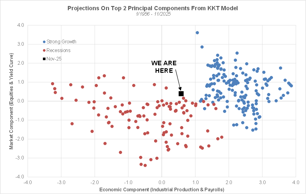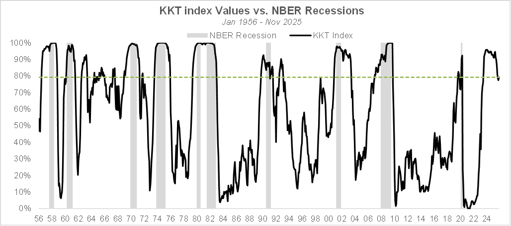 The AI boom has not just contributed to strong market returns over the past 3 years. Its impact has also been felt in aggregate economic activity in recent quarters, since the growth in capital expenditures related to the buildup of AI data centers has been high enough to generate a sizeable contribution to GDP growth despite AI capex having a relatively low weight in the economy: this year through the end of Q2, tech capex has contributed more to GDP growth than the whole of consumer spending, and it is one of the main engines behind the current upswing in the economic cycle. As government agencies in charge of producing economic statistics continue to grapple with the consequences of the shutdown, we still have a blurry and stale picture of the US economy. The KKT index, which we use to assess the current position of the economy in the business cycle, uses monthly industrial production and non-farm payrolls numbers as inputs, and the latest data point for both releases pertains to the month of September. Given that recent ADP payroll numbers and published data pertaining to the manufacturing sector have been weak overall, I ran an update of the index assuming zero payroll creation and zero growth in the industrial production index for the month of October. Based on those assumptions, the KKT index has increased slightly from 77.2% at the end of October to 79.2% at the end of November but is still consistent with the US economy moving out of recession. GDP has grown at a 3.8% annualized rate in Q2 and GDPNow expects 3.5% growth in Q3. It is plausible that the shutdown may have slowed down economic growth in Q4, but various measures included in the Big Beautiful Bill may lead to a reacceleration in Q1.