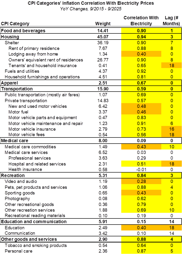 While in aggregate, GDP growth since Q2 has been relatively robust, perceptions about the state of the economy have been rather negative, with the University of Michigan consumer sentiment’s recent readings sitting near post GFC lows. Because of the K shaped nature of the economy (whereby a disproportionate share of economic gains accrues to top wealth holders and income earners), issues related to affordability and the cost of living have taken center stage and are starting to have political consequences, with the election of a far-left candidate as mayor of NYC and increasingly vocal complaints by figures in the MAGA movement that domestic (and especially economic) issues are not receiving enough attention from the Trump administration. The growth in demand for electricity by AI data centers adds more salt to those wounds, as consumers are facing significant hikes in their utility bills, not to mention potential brownouts as the grid may struggle to meet the increased demand. In addition, as shown in the table below, because electricity is a key input in the production of many products and services, electricity price inflation tends to be followed – in most cases with a lag of just a few months or less – by inflation in most components of the CPI. Therefore, the AI boom could indirectly be responsible for a resurgence in inflation. Besides encouraging solutions like behind the meter systems to avoid overburdening the grid and aiming to grow the supply of all domestic sources of energy to the maximum extent possible, an option to contain the rise in electricity prices in the US would be to build more data centers in allied countries – like the Gulf countries – with access to plenty of cheap energy. The bottom line is that the still-too-high inflation, which disproportionately impacts those who are left out of this bifurcated economy, is likely going to be a key topic in the months leading to the midterms. Over the past 20 years, the president’s party has been punished at the midterms, and there is no compelling reason to expect a different outcome in 2026: according to both Polymarket and Kalshi, the Democrats have a 75% chance of retaking the House. However, a severe defeat – which could become a real possibility if inflation re-accelerates next year – would make it much harder for the Trump administration to further pursue its ambitious agenda. In that regard, Trump seems to view a Fed chair who lowers rates as an asset – pun intended – but it could turn out to be a liability.