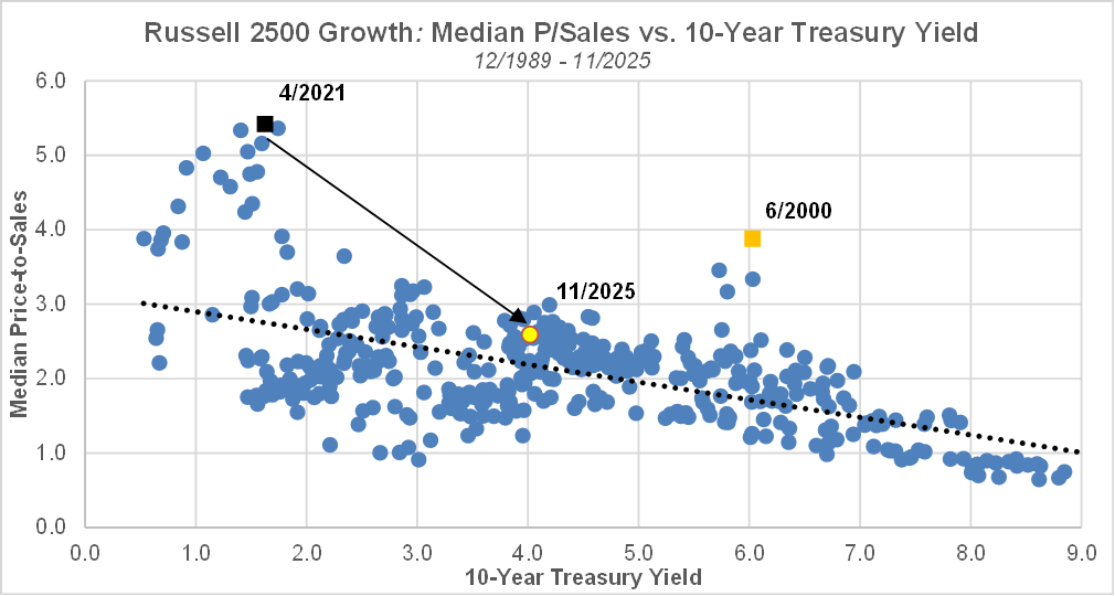 As we have mentioned repeatedly over the past few months, aggregate market valuations continue to be heavily skewed by a smaller number of mostly AI-related mega caps. However, the median valuation for small & mid cap growth stocks remains broadly consistent with the current level of the 10-year yield and is nowhere near the extremes reached in 6/2000 and 4/2021.