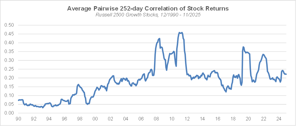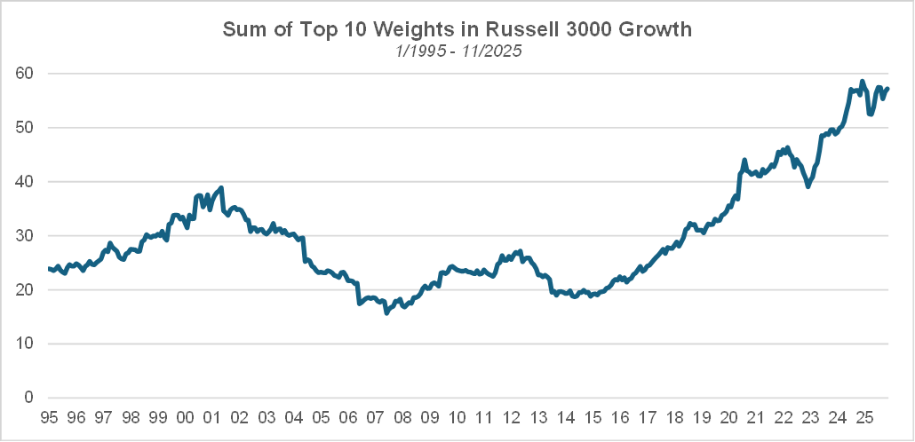 Getting back to comparisons between the current AI boom and the internet bubble, the current level of market cap concentration with the broader Russell 3000® Growth benchmark is much higher than it was at the peak of the internet bubble. The 10 largest weights in the index represent 57% of total weight as of November 2025 vs. 39% back then.