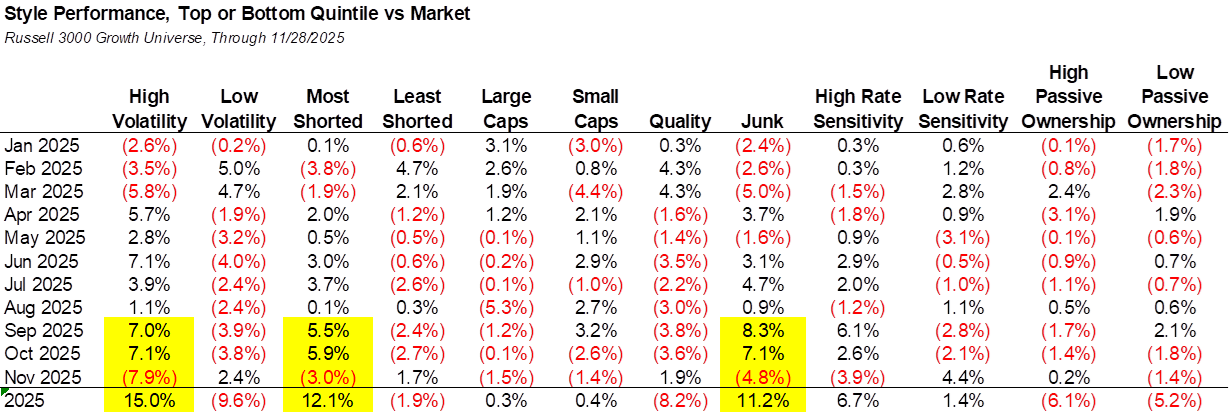 A key benefit from looking at the performance of quant factors is that they reveal insights into investors’ preferences. In particular, the performance of factors – like high vs. low volatility stocks – that are sensitive to macro regimes provides indications on investors’ sentiment and potentially their views on the state of the economy. After a very strong run since April, high volatility stocks have under-performed meaningfully last month, along with junk and most shorted stocks. By contrast, high quality, low volatility, least shorted stocks have outperformed.