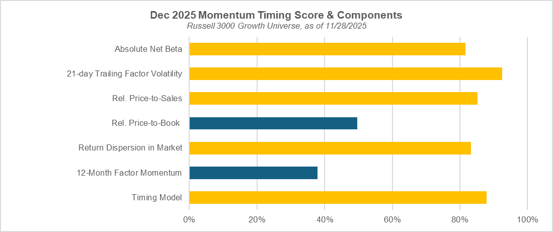Our momentum timing model continues to indicate that high momentum stocks have a high probability of under-performing in December. The model’s indication is supported by 4 of the 6 underlying variables: the return dispersion within the market observed last month, the trailing 21-day momentum volatility, the absolute net beta of the momentum factor and the relative price-to-sales multiple of high momentum stocks. After a strong run since September, high momentum stocks underperformed materially last month, and the timing model indicates that more downside is to come.