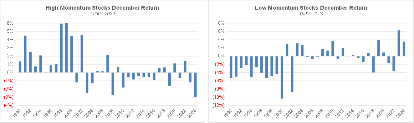However, according to the empirical research literature, December has traditionally been a favorable month for the momentum factor, because of tax loss harvesting towards the end of the year, as investors hold on to their winners and sell their losing positions, providing more fuel to the momentum effect. In the Growth universe, we do observe that on average since 1990, the top quintile of price momentum has indeed outperformed in December while the bottom quintile has underperformed. However, as the chart below reveals, this average observation relies primarily on the data from the 1990s, and the pattern has become far less evident since.