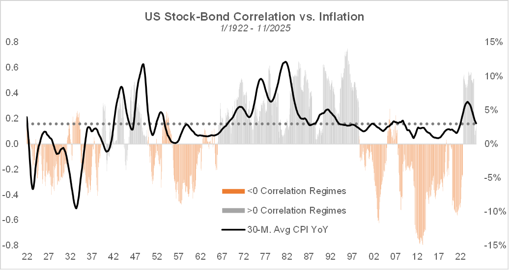 Fortunately, the dollar’s reserve currency status makes foreign investors more lenient towards the US’s large twin deficits. However, those deficits can’t be sustained for very long, because inflation, and thus interest rates remain stuck at significantly higher levels than the pre-COVID norm. Despite the Fed’s best efforts over the past 3 years or so, inflation remains 50% above target. The meaningfully positive stock-bond return correlation that has prevailed since mid-2022 suggests we have entered a higher inflation regime. As shown below, over the past 100 years, periods of high (low) stock-bond return correlation have been associated with relatively high (low) levels of consumer price inflation.