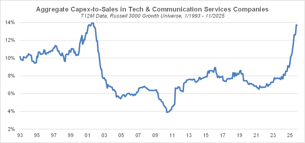 While much commentary has been made regarding the sustainability of AI capex spending, the aggregate capex-to-sales ratio for companies in the technology and communication services sectors, at 13.7%, is slightly below the peak of 14% reached during the tech bubble of 25 years ago.