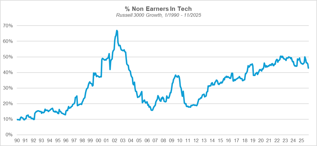 However, the percentage of non-earners (companies with negative net income over the past 12 months) in the tech sector so far in the current AI boom is much lower than it was at its peak in the aftermath of the internet bubble.