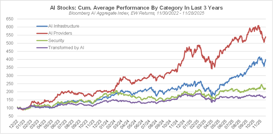 While the AI theme in aggregate has generated strong returns over the past 3 years, the tide has not lifted all boats to the same extent. With the help of ChatGPT, I categorized the 86 US listed constituents within the Bloomberg Artificial Intelligence Total Return Index into buckets according to a taxonomy we have created for our own AI portfolio. Companies in the AI infrastructure bucket provide the tools that make AI possible, like chips or coolant for data centers. AI providers are the ones who develop AI models and solutions. AI Security companies help their customers address the new security threats that have emerged because of the availability of AI tools. The “Transformed by AI” bucket corresponds to companies whose business is not related to AI but that are poised to benefit from the deployment of AI. As shown below, and consistent with our prior observations, AI providers have far outperformed other AI stocks over the past 3 years. AI infrastructure stocks (the proverbial “picks and shovels”) have also performed well. By contrast, the returns to AI security and transformed by AI companies have lagged materially.