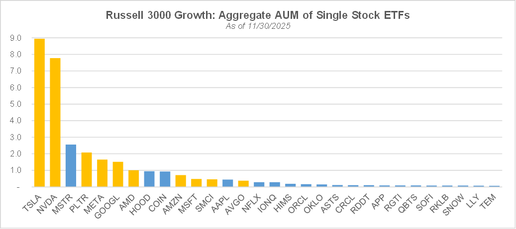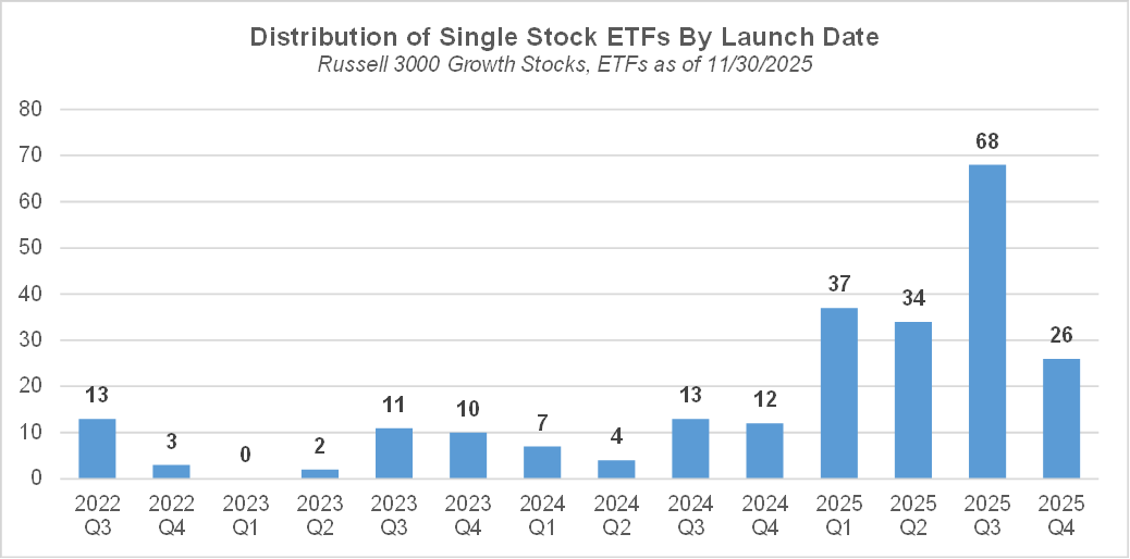 A noticeable development in the more recent episode of risk seeking investor sentiment is the accelerating pace of issuance of levered single stock ETFs, which provide yet another avenue for high octane speculative bets. The chart below shows that 68% of the single stock US ETFs whose underlying is one of the Russell 3000® Growth’s constituents and that are in existence as of the end of November 2025 have been issued in 2025.